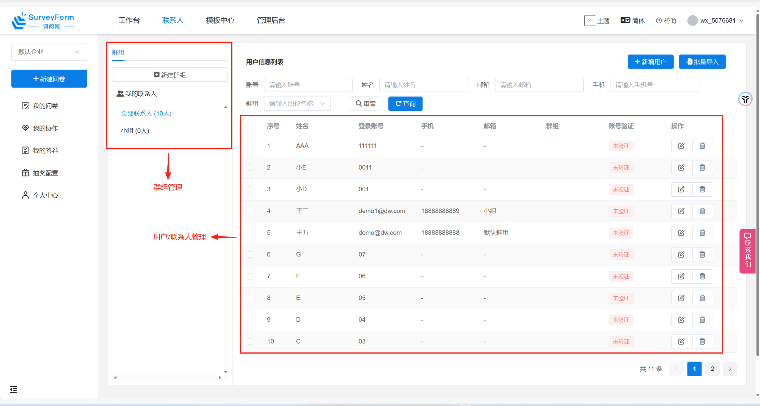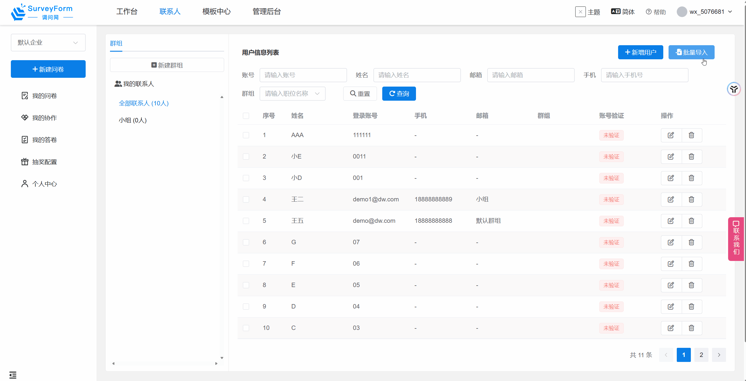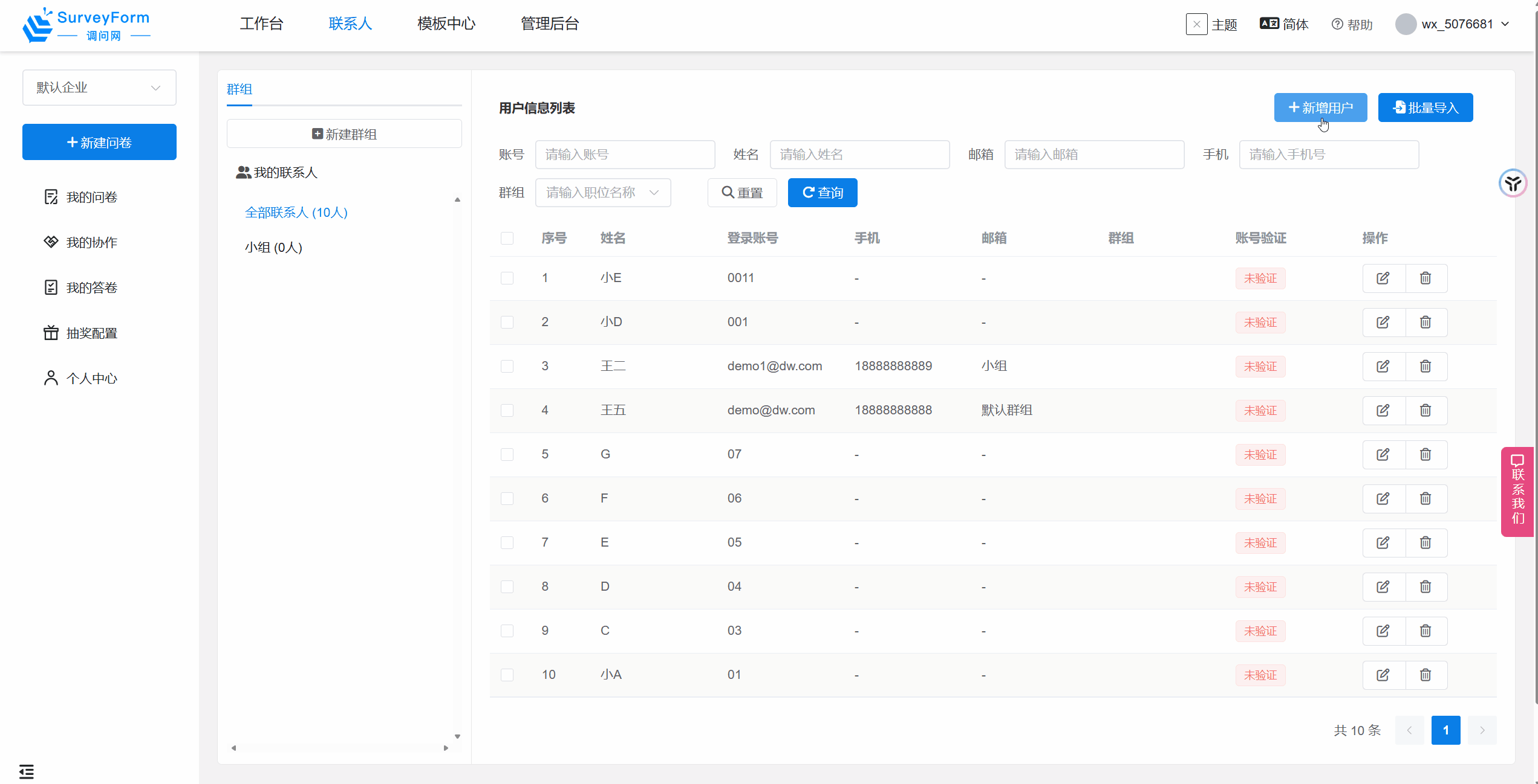 新增用户,将用户基本信息保存到联系人列表之中,便于后续答卷者绑定。