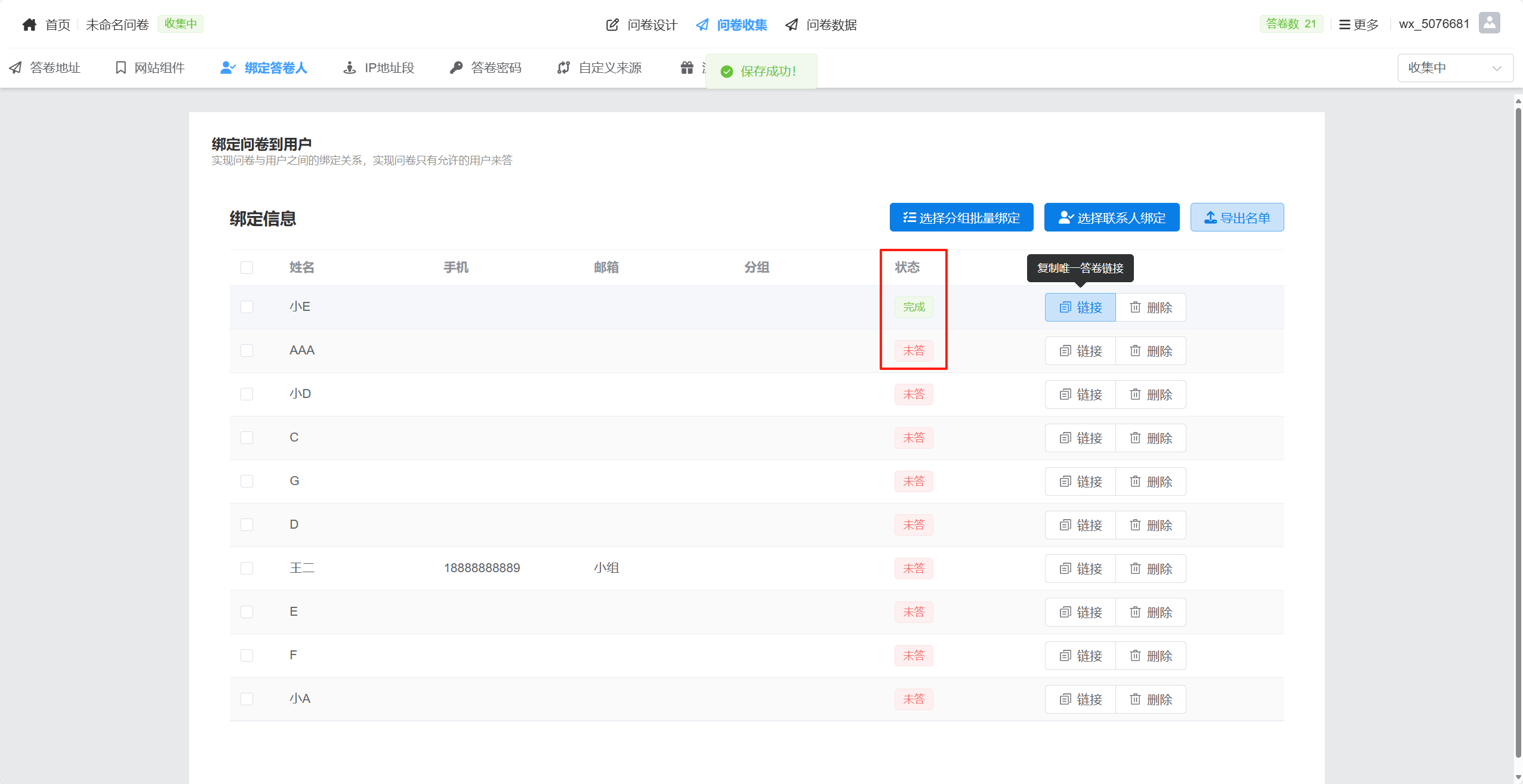 - 绑定成功后,会显示绑定信息,自动生成唯一填写链接