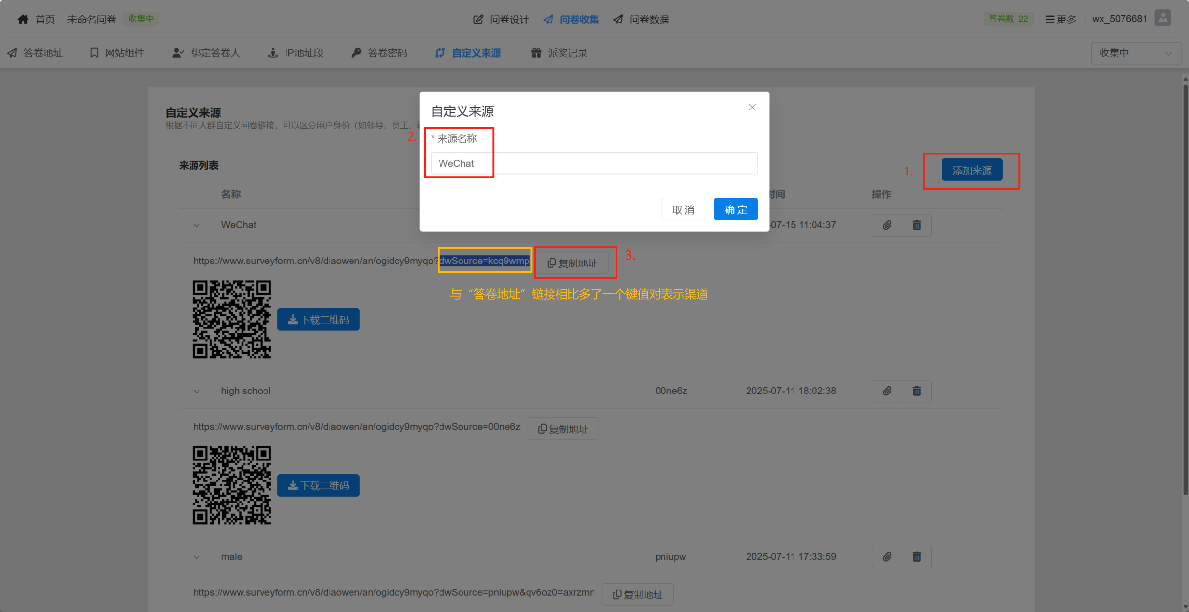 可以看到,“自定义来源”这里的链接地址,与“答卷地址”处的链接,多了一个键值对?dwSource=kcq9wmp,我们就是通过这个多出来的部分来识别问卷来源/渠道。