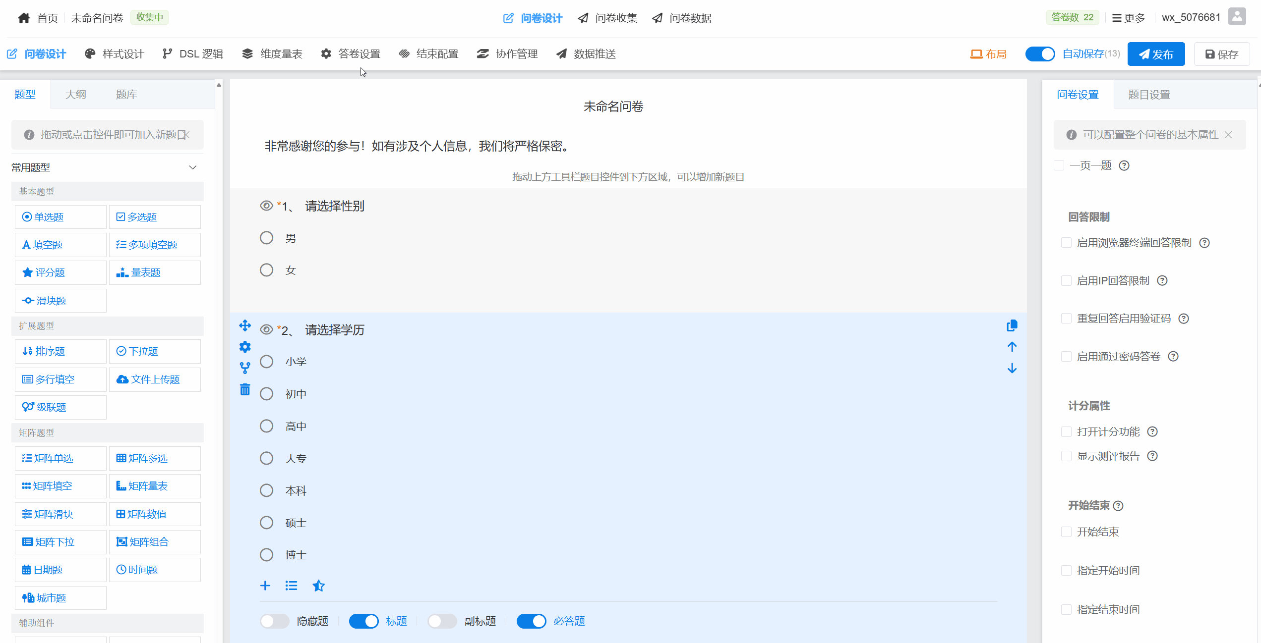 答卷密码是指在访问问卷前,要求受访者输入预设密码才能进入问卷填写页面。用于对问卷设置访问权限,确保内容安全、控制答题人范围。