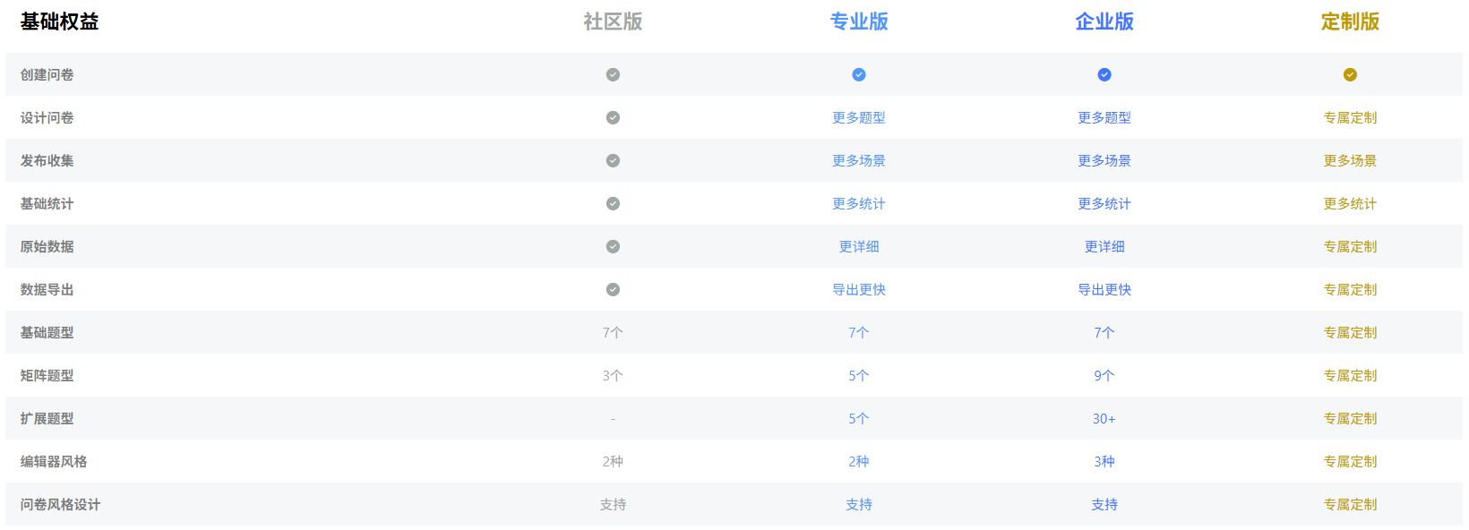 企业版系统提供更完善的题型与操作体验,具体体现在有逻辑跳转、逻辑显示、多对多跳转关系、多对多显示关系,问卷预览、评分题、排序题、矩陈单选题、矩陈多选题、矩陈填空题、矩陈评分题等功能细节上的优化。 企业版系统提供除商业版功能外,还提醒完善的中后台管理系统,其中包括用户、部分、角色、权限控制、资源管理、问卷管理,问卷模块还提供自定/