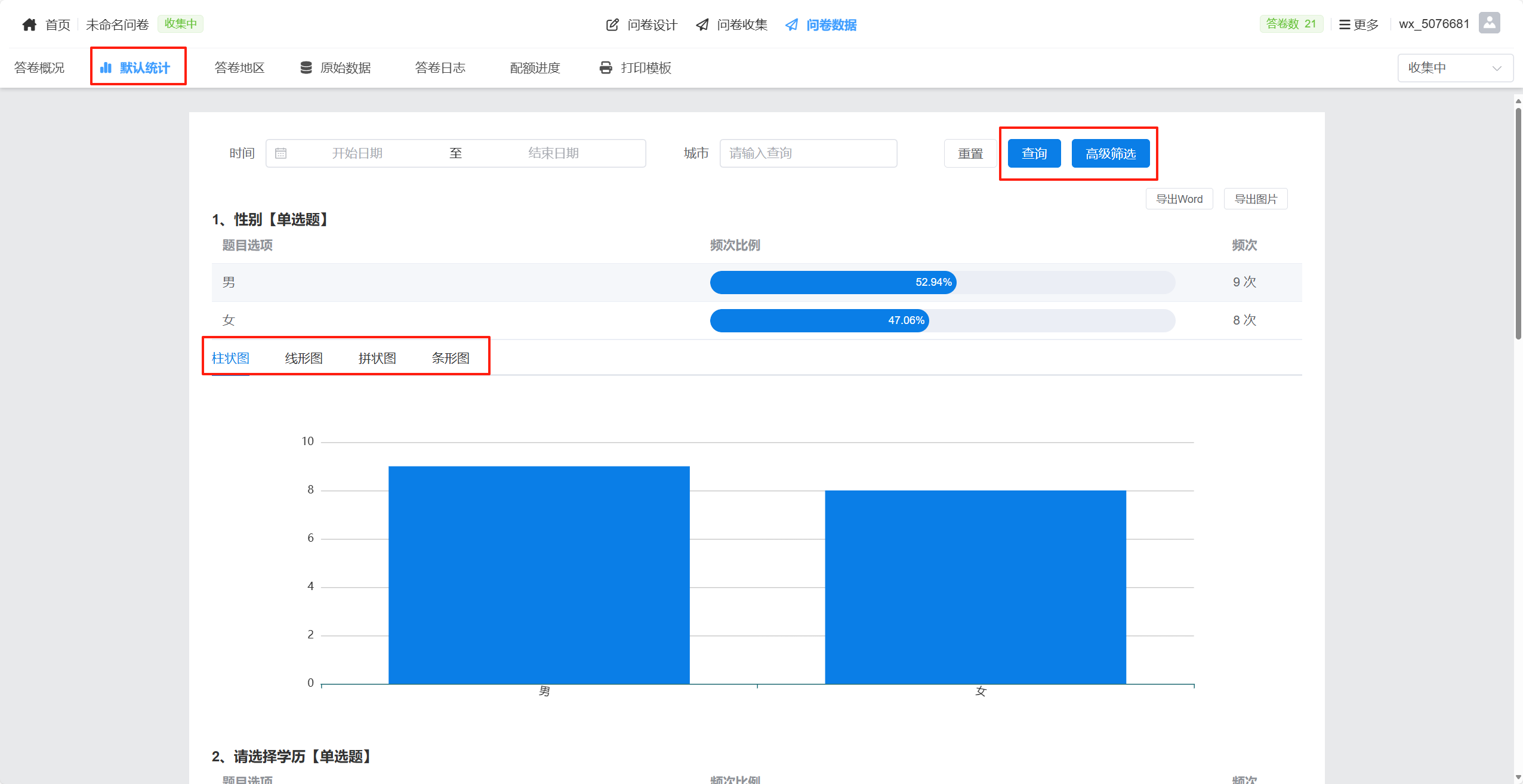 每个题目的所有选项将被统计出选择次数与占总答卷的百分比,用于了解选项受欢迎程度、受访者倾向等关键指标。 - 多种图形展示形式任选: