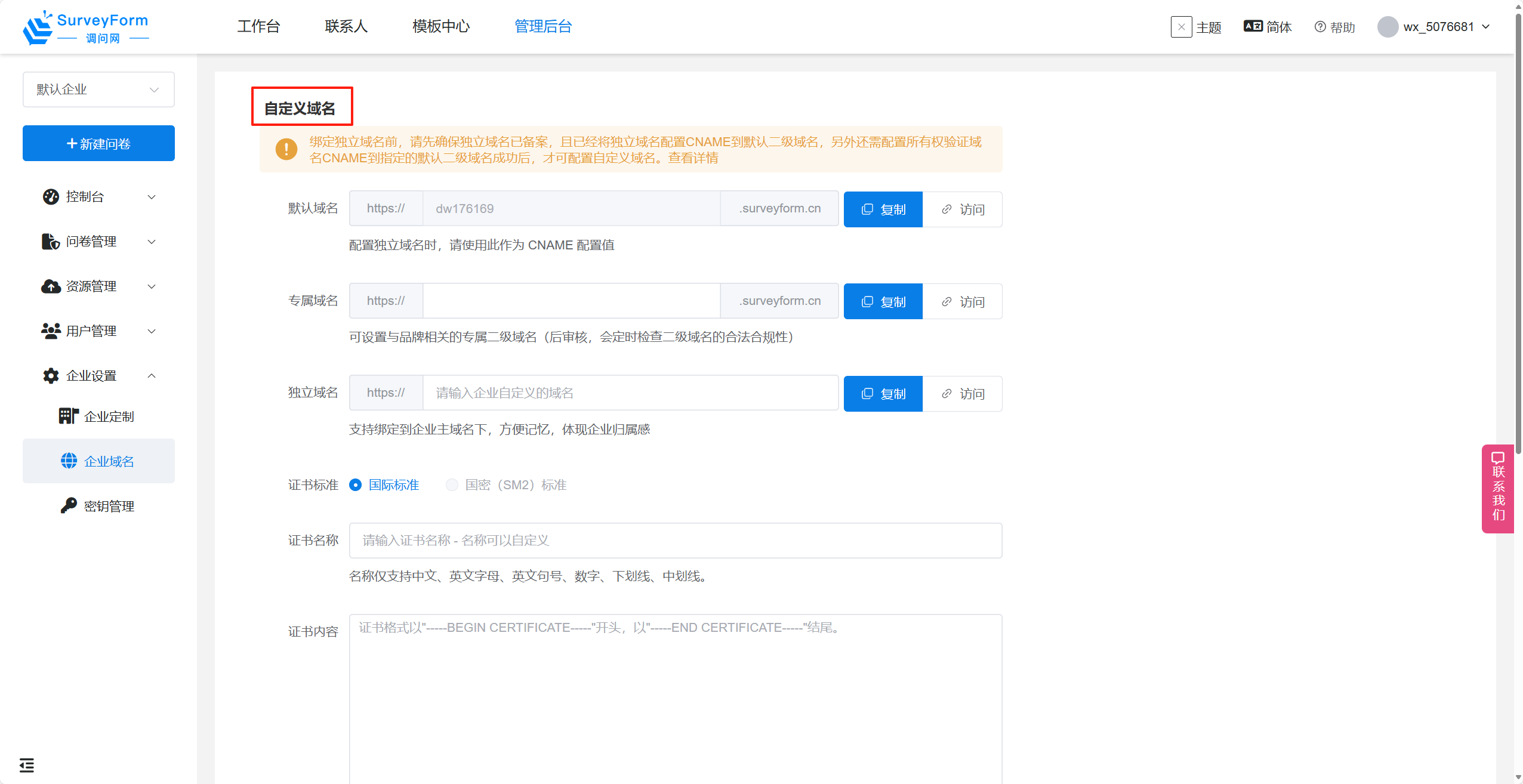 使用在线版本中,还可以自定义域名: 在“管理后台-企业设置-企业域名”中填写相关信息即可自定义域名。