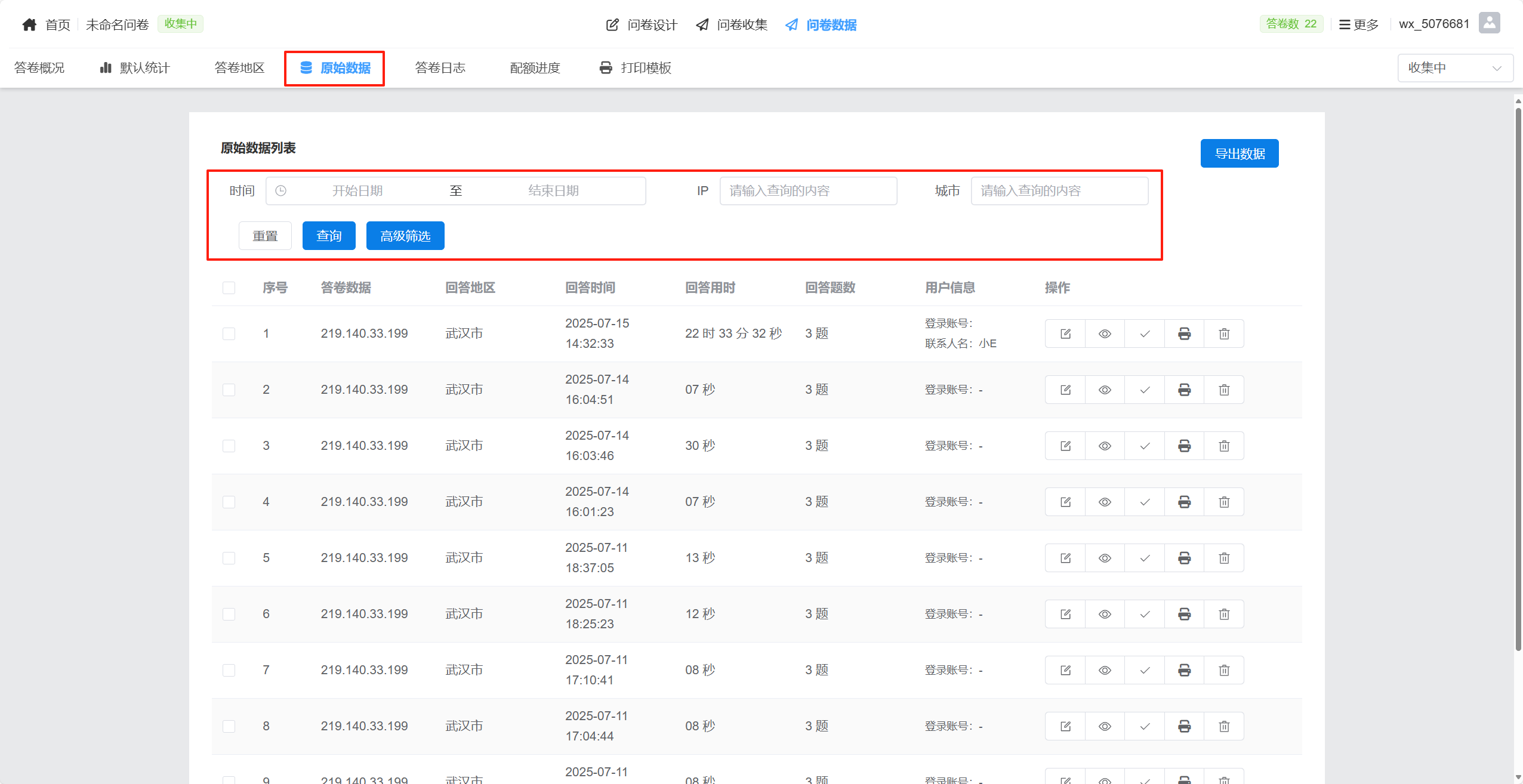原始数据查看是指用户可在系统后台查看每一份已提交答卷的完整作答记录,包括答题人填写的每个问题答案,以及系统自动记录的提交时间、IP、设备类型等信息,便于精细分析、问题定位和数据溯源。