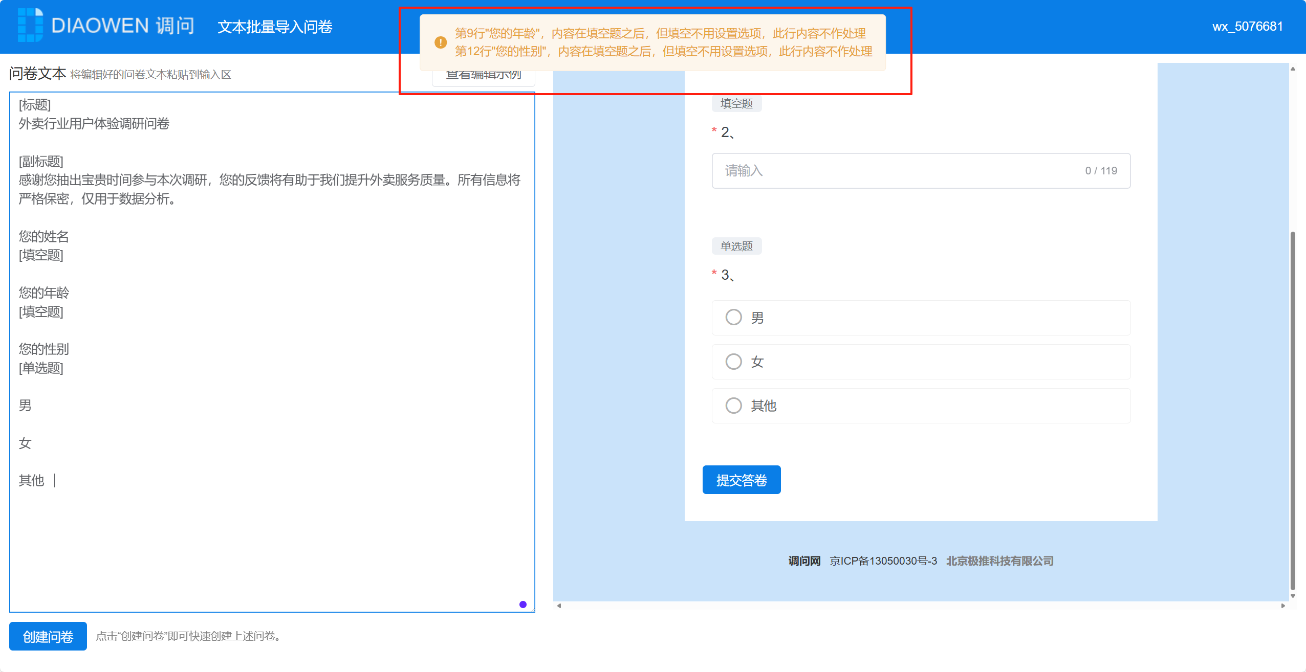 - 在左侧区域,将编辑好的问卷文本粘贴到输入区