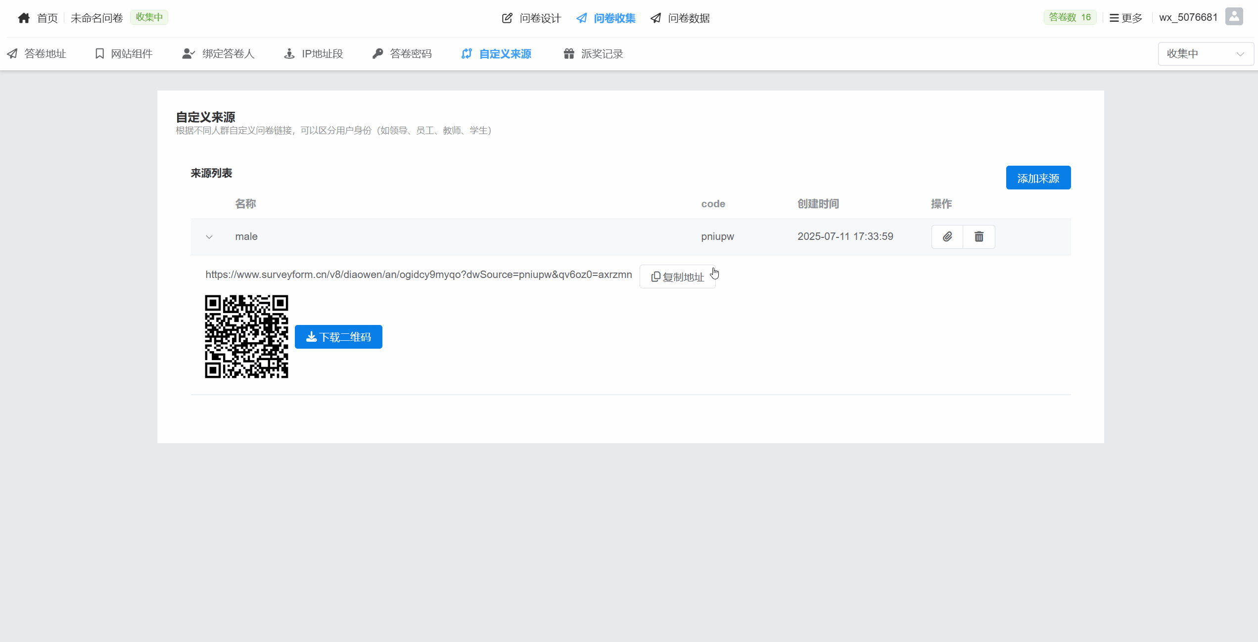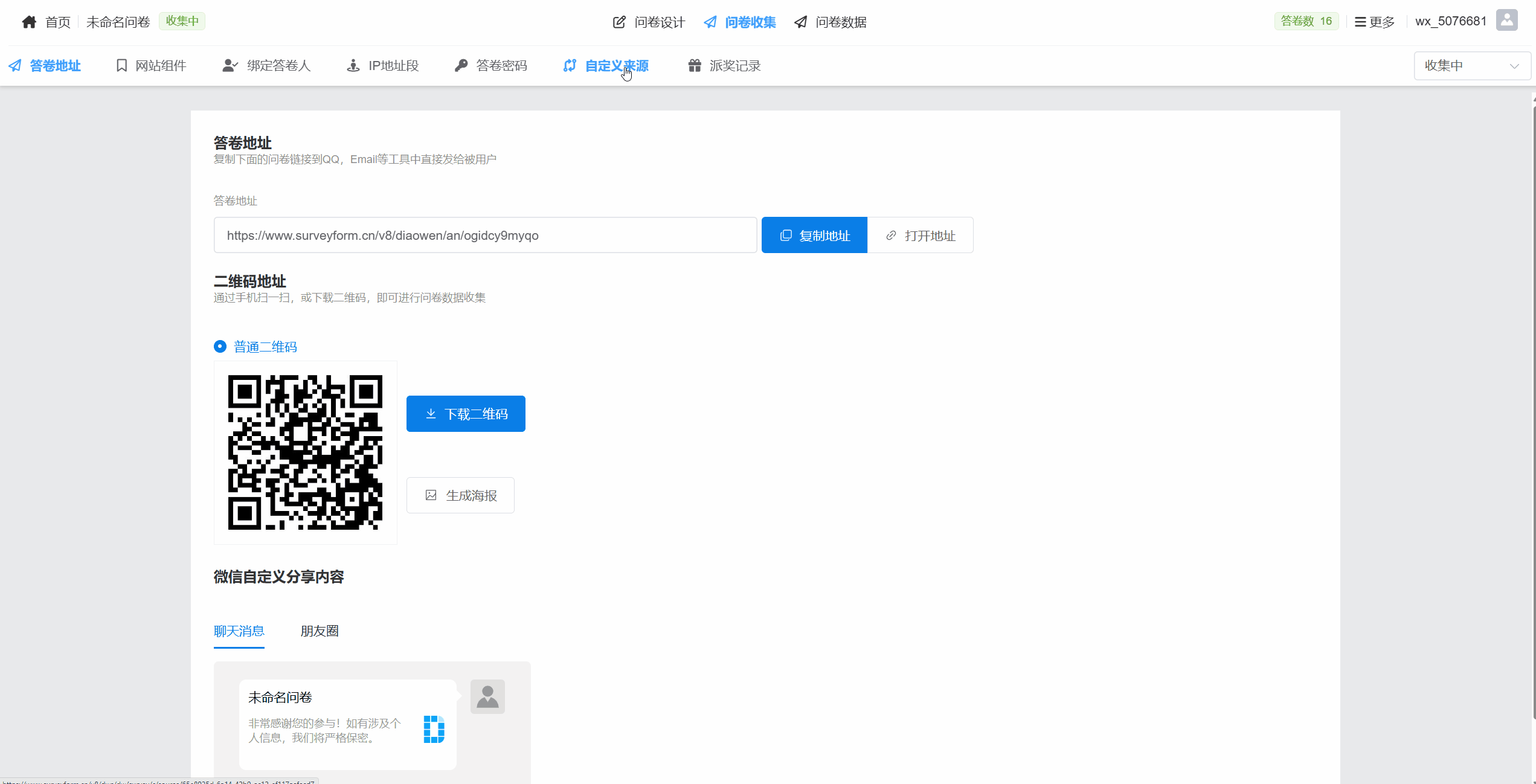 在“问卷收集”页面,打开“自定义来源