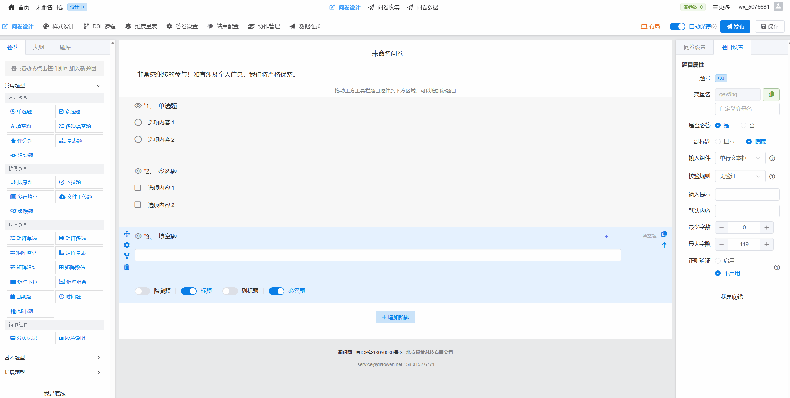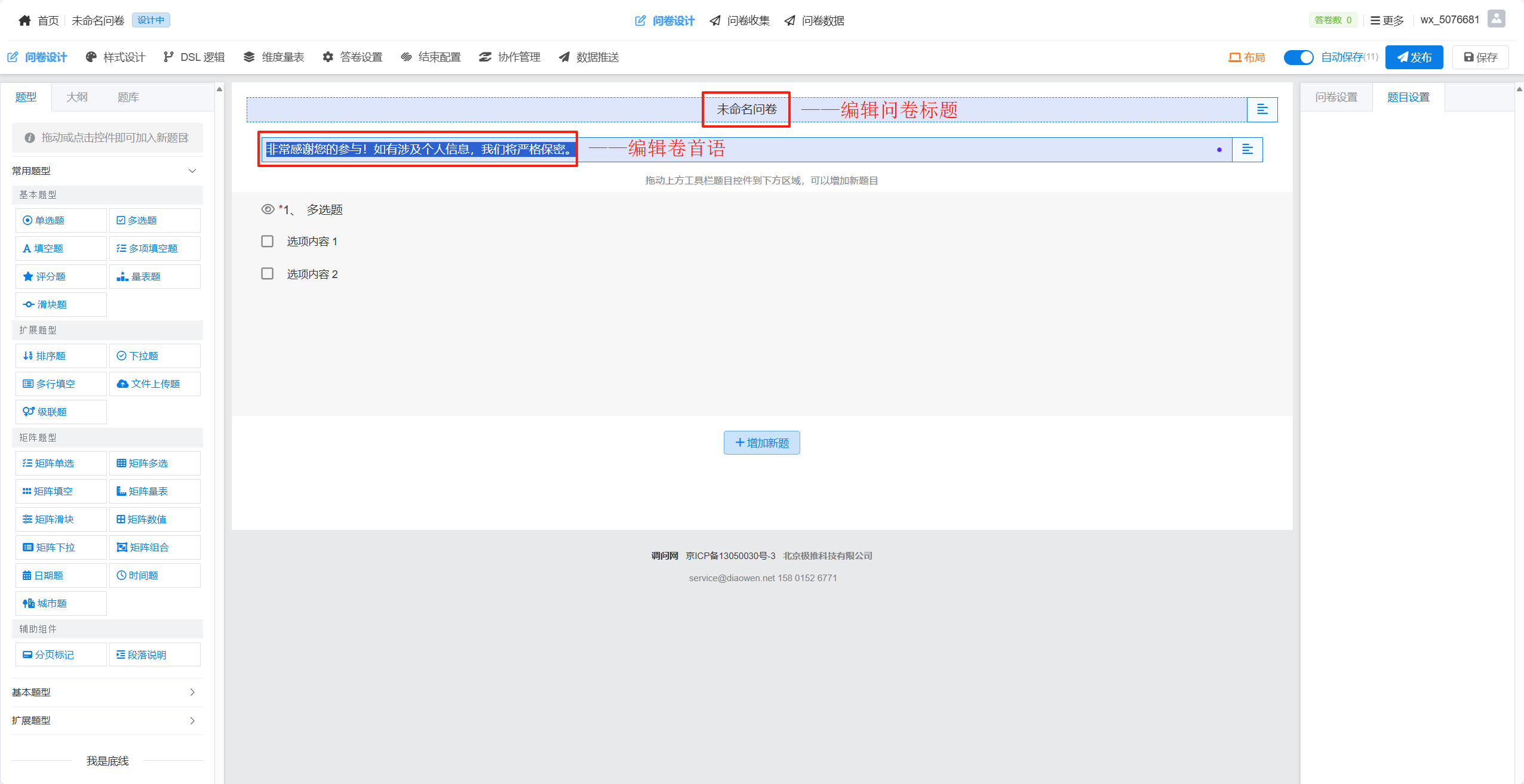 拖动控件/点击控件/点击“+增加新题”添加题型